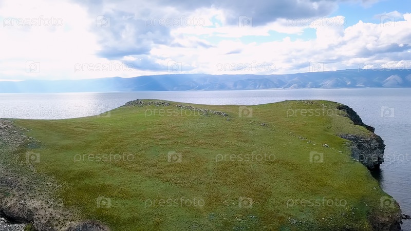 Полет над землей и водой. Россия, Байкал, залив Малое Море. Остров Харанцы. Рядом с островом Ольхон, с дрона