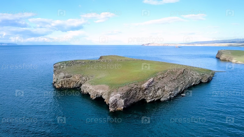 Полет над землей и водой. Россия, Байкал, залив Малое Море. Остров Харанцы. Рядом с островом Ольхон, с дрона