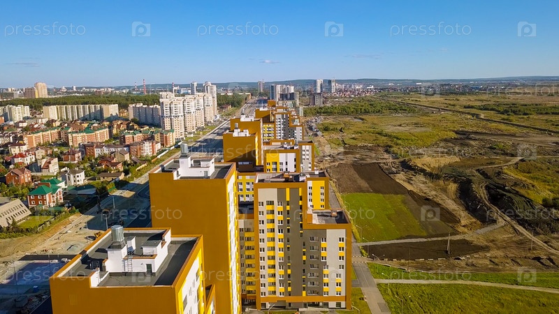 Новостройки в новом районе города Екатеринбурга. Строительство домов, парков и дорог. Быстрый полет над рядом новых домов. Россия, с дрона