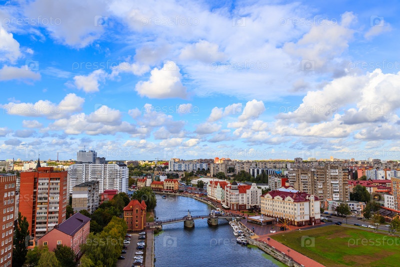 Центральная часть города Калининграда, набережная Рыбной деревни, Юбилейный мост. Калининград, Россия