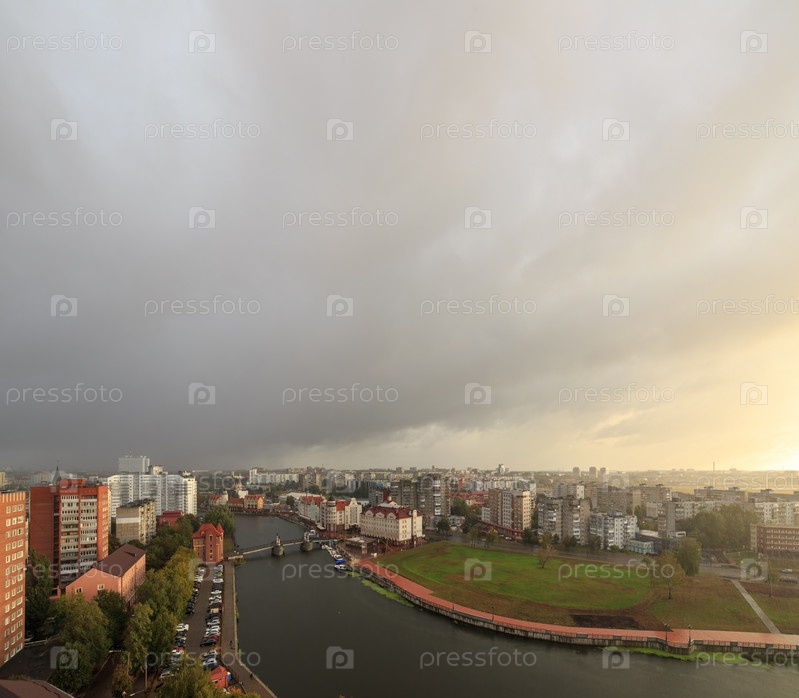 Дождь над городом. Центральная часть города Калининград, Россия
