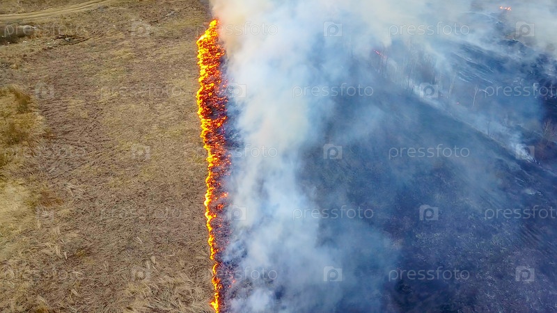 Большой пожар. Горит сухая трава. много дыма. Екатеринбург, Россия, Из Дрона