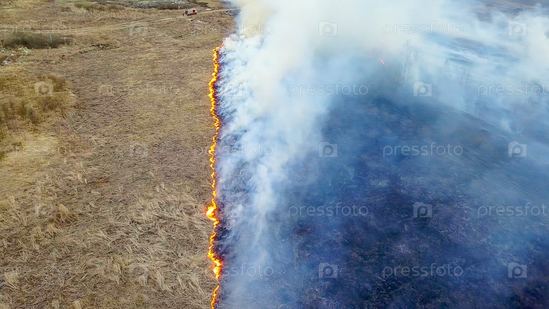 Большой пожар. Горит сухая трава. много дыма. Екатеринбург, Россия, Из Дрона