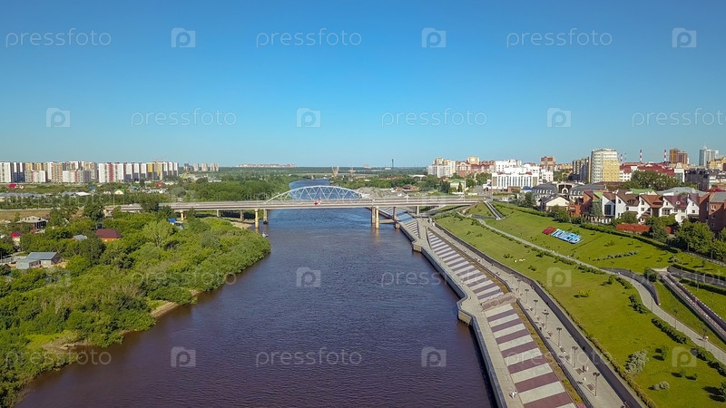 Город Тюмень, набережная реки Туры, автомобильный мост Челюскинцев.Россия, Текст на русском языке - 432 TYUMEN, From Dron