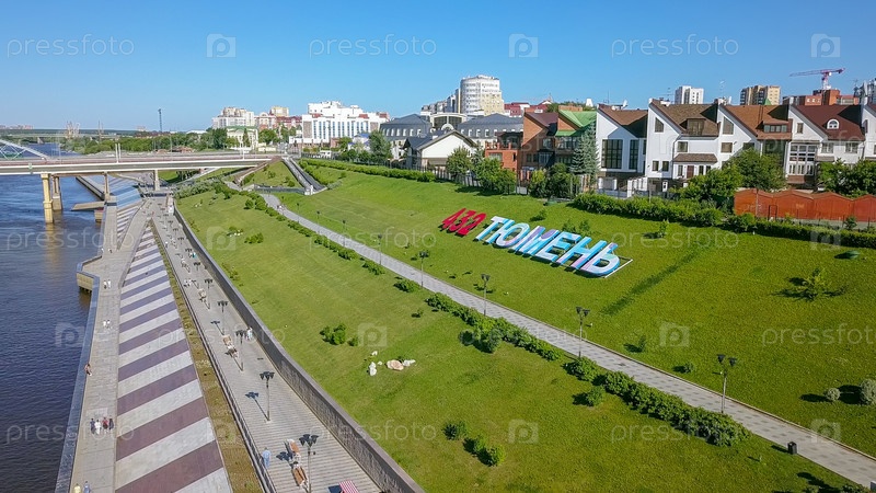Город Тюмень, набережная реки Туры, автомобильный мост Челюскинцев.Россия, Текст на русском языке - 432 TYUMEN, From Dron
