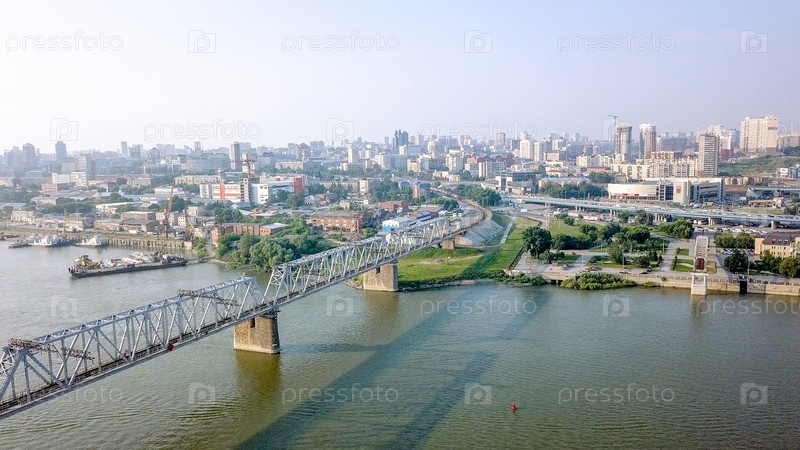 Первый железнодорожный мост в Новосибирске. Панорама города Новосибирска. Вид на реку Обь. Россия, Из Дрона