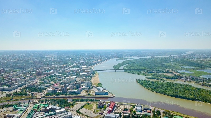 Слияние рек Иртыш и Омь, панорамный вид на город. Омск, Россия, Из Дрона