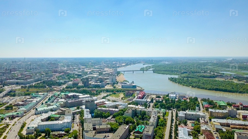 Слияние рек Иртыш и Омь, панорамный вид на город. Омск, Россия, Из Дрона