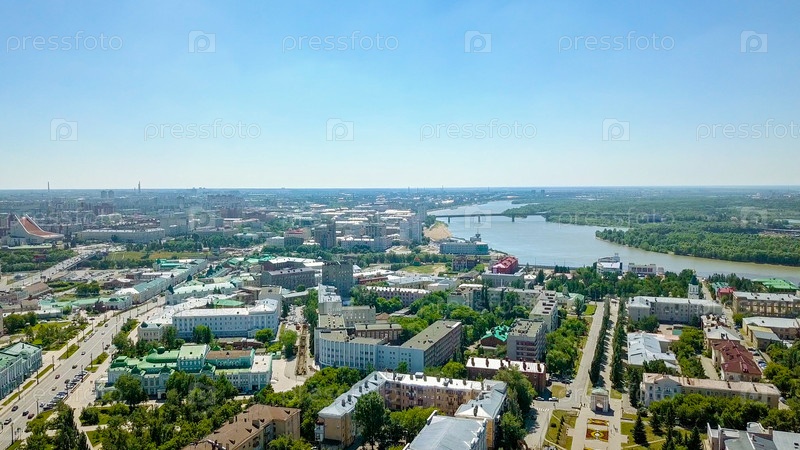 Слияние рек Иртыш и Омь, панорамный вид на город. Омск, Россия, Из Дрона