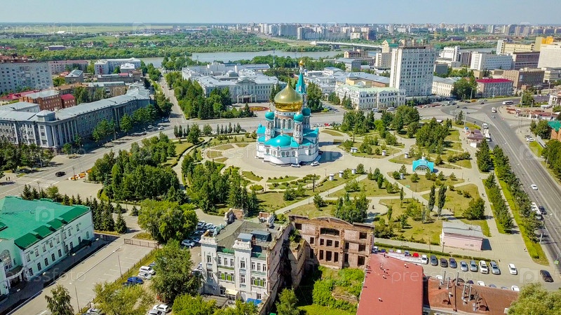 Собор Успения Пресвятой Богородицы, панорамный вид на город. Омск, Россия, Из Дрона
