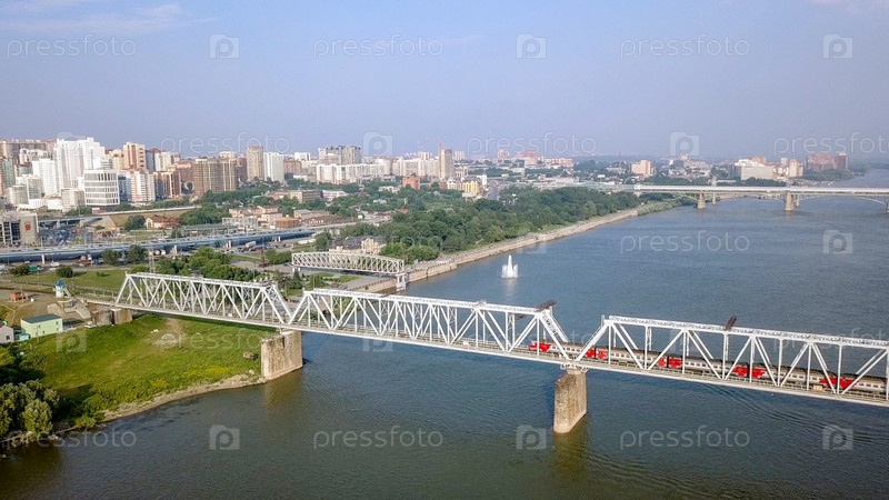 Электропоезд пересекает реку Обь. Первый железнодорожный мост в Новосибирске. Панорама города Новосибирска. Россия, Из Дрона