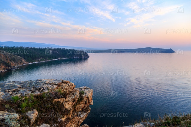 Россия, озеро Байкал, остров Ольхон, залив Малое море. Мыс Улан-Хушун. Вид с мыса Нюрган. Переход от заката к ночи