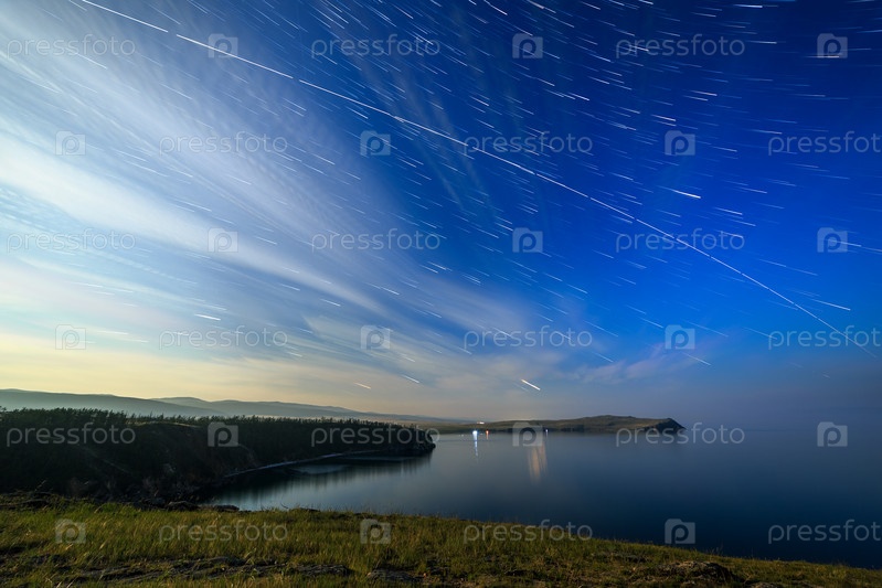 Россия, озеро Байкал, остров Ольхон, облака и звезды в лунную ночь над заливом Малого моря. Короткие затухающие следы от звезд, эхо сквозь облака