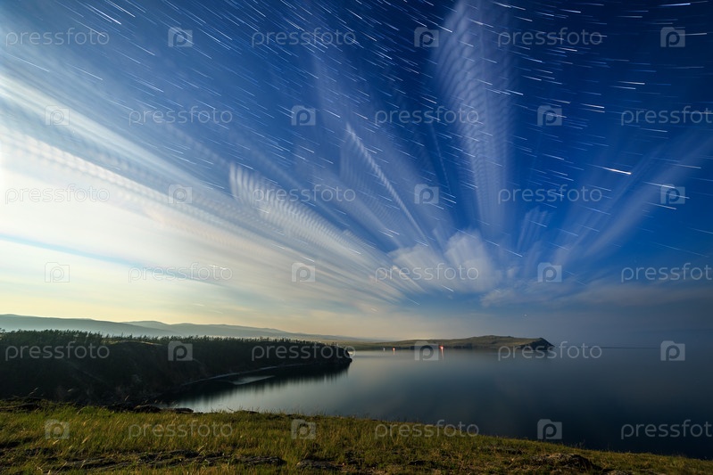 Россия, озеро Байкал, остров Ольхон, облака и звезды в лунную ночь над заливом Малого моря. Короткие затухающие следы от звезд, эхо сквозь облака