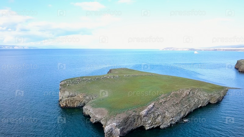 Полет над землей и водой. Россия, Байкал, залив Малое Море. Остров Харанцы. Рядом с островом Ольхон, с дрона