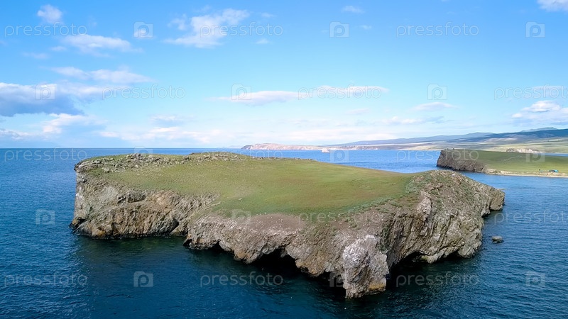 Полет над землей и водой. Россия, Байкал, залив Малое Море. Остров Харанцы. Рядом с островом Ольхон, с дрона