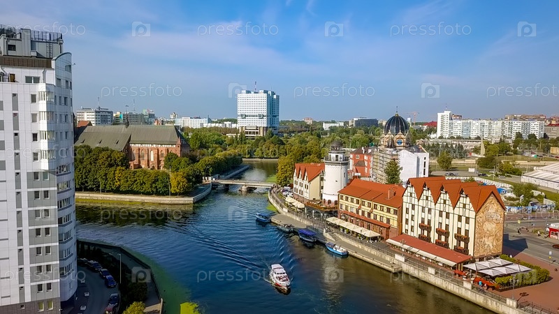 Вид с воздуха на центр Калининграда. Маяк в Рыбной деревне, Медовый мост. Россия
