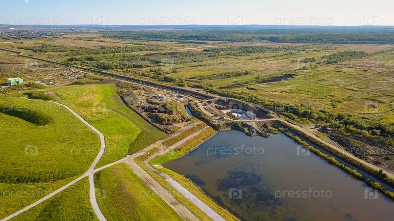Новостройки в новом районе города Екатеринбурга. Строительство гидротехнических сооружений. Россия, с дрона