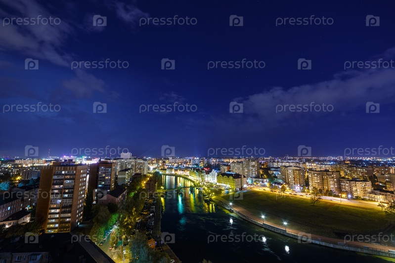 Огни ночного Калининграда. Река Преголя, набережная Рыбной деревни и Юбилейный мост. Россия, Калининград