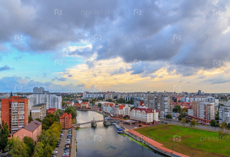 Центральная часть города Калининграда, набережная Рыбной деревни, Юбилейный мост. Калининград, Россия