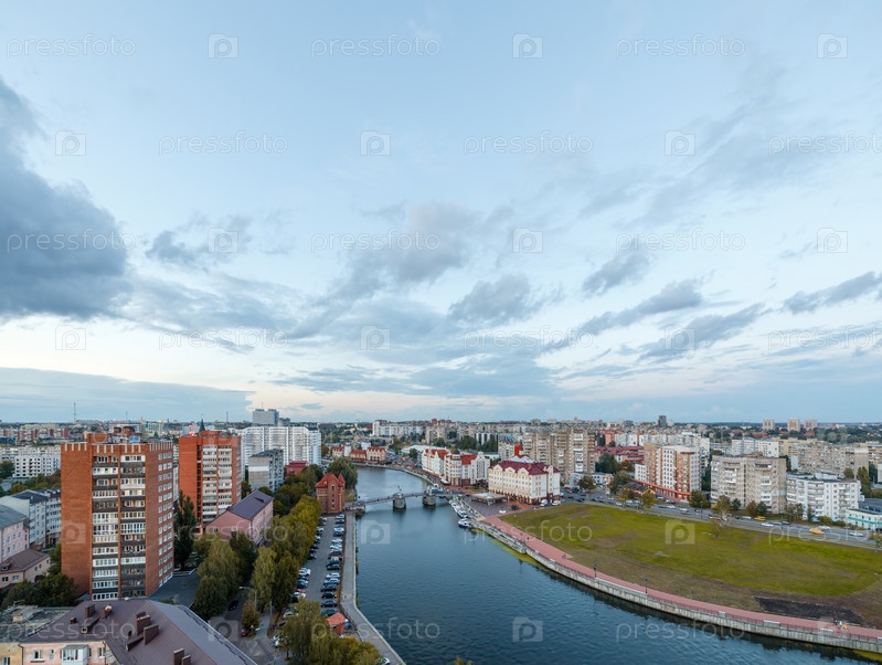 Вечерний Калининград. Река Преголя, набережная Рыбной деревни и Юбилейный мост. Россия, Калининград