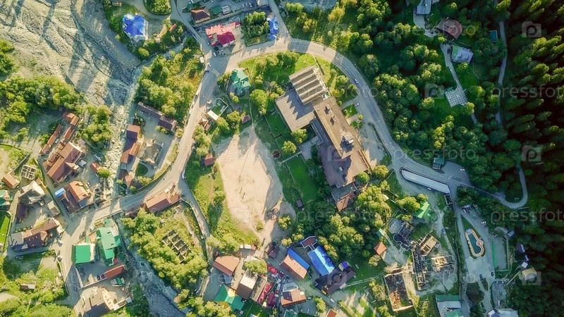Горная деревня. Полет в горах. Домбайская Поляна, Карачаево-Черкесия, Северный Кавказ. Россия