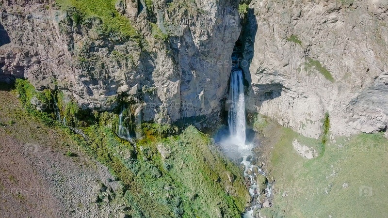 Эльбрус с севера. Водопад Султан на реке Кызыл-Су. С высоты птичьего полета. Кабардино-Балкария, Россия