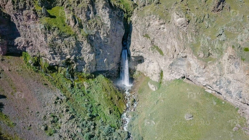 Эльбрус с севера. Водопад Султан на реке Кызыл-Су. С высоты птичьего полета. Кабардино-Балкария, Россия
