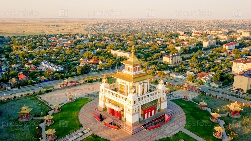 Золотая обитель Будды Шакьямуни на рассвете — крупнейший буддийский храм Республики Калмыкия, один из крупнейших буддийских храмов Европы. Элиста, Россия
