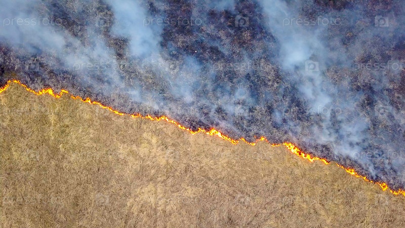 Большой пожар. Горит сухая трава. много дыма. Екатеринбург, Россия, Из Дрона
