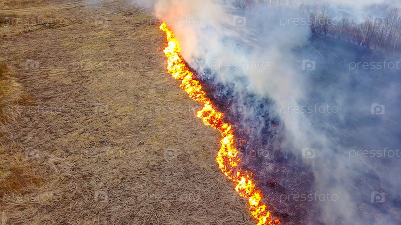 Большой пожар. Горит сухая трава. много дыма. Екатеринбург, Россия, Из Дрона
