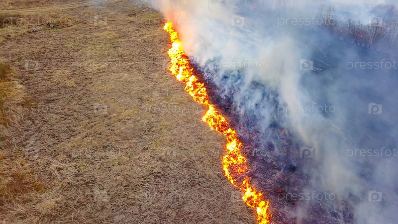 Большой пожар. Горит сухая трава. много дыма. Екатеринбург, Россия, Из Дрона