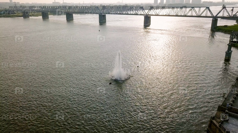 Первый железнодорожный мост в Новосибирске. Панорама города Новосибирска. Вид на реку Обь. Россия, Из Дрона