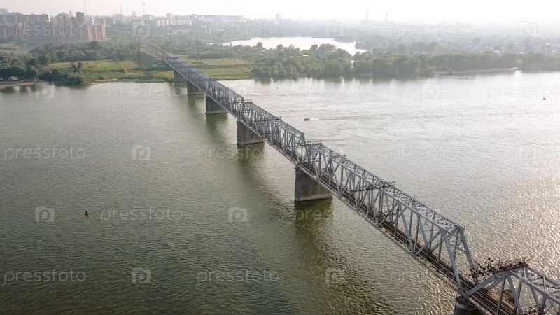 Первый железнодорожный мост в Новосибирске. Панорама города Новосибирска. Вид на реку Обь. Россия, Из Дрона