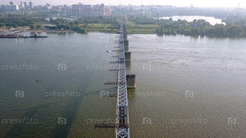 Первый железнодорожный мост в Новосибирске. Панорама города Новосибирска. Вид на реку Обь. Россия, Из Дрона