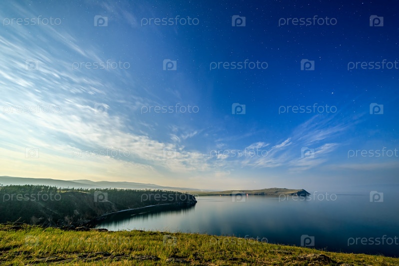 Россия, озеро Байкал, остров Ольхон, облака и звезды в бухте Малого моря. Мыс Саган-Хушун