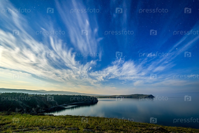 Россия, озеро Байкал, остров Ольхон, облака и звезды в бухте Малого моря. Мыс Саган-Хушун