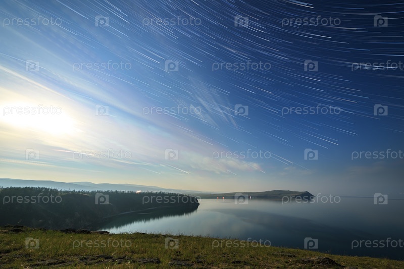 Россия, озеро Байкал, остров Ольхон, облака и звезды в лунную ночь над заливом Малого моря. Длинные затухающие следы от звезд, эхо сквозь облака