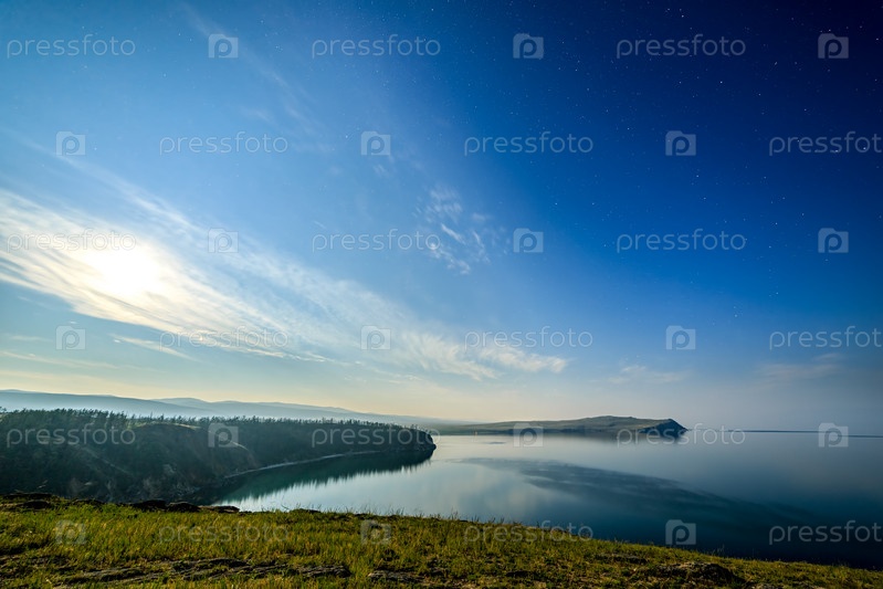Россия, озеро Байкал, остров Ольхон, облака и звезды в бухте Малого моря. Мыс Саган-Хушун
