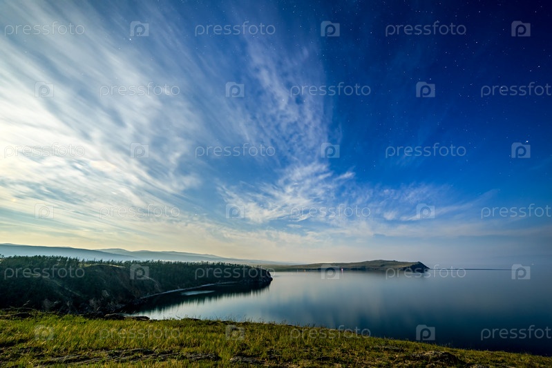 Россия, озеро Байкал, остров Ольхон, облака и звезды в бухте Малого моря. Мыс Саган-Хушун