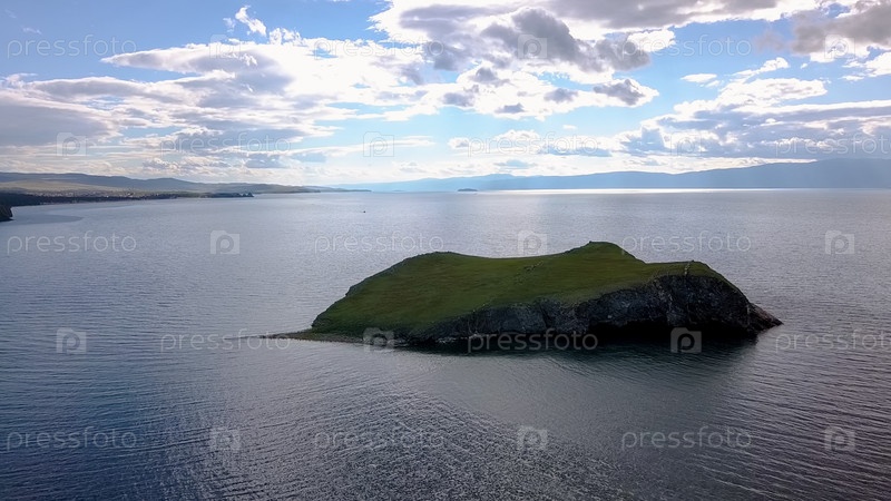 Полет над землей и водой. Россия, Байкал, залив Малое Море. Остров Харанцы. Рядом с островом Ольхон, с дрона