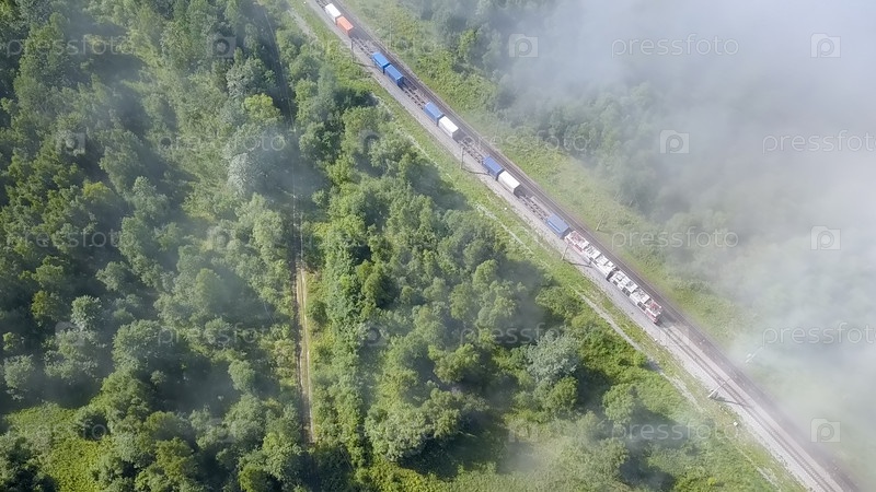 Поезд едет по железной дороге под облаками вдоль побережья. Трансибирская железная дорога. Полет над облаками. Побережье Байкала, с дрона