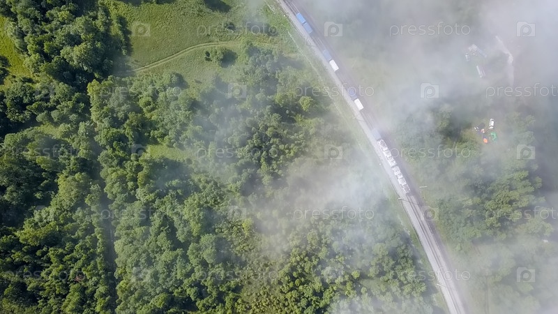 Поезд едет по железной дороге под облаками вдоль побережья. Трансибирская железная дорога. Полет над облаками. Побережье Байкала, с дрона