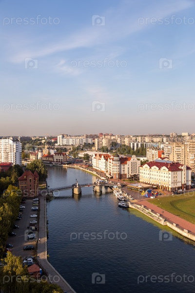 Закатный свет центра Калининграда. Юбилейный мост, Рыбная деревня, Каналы реки Преголя. Россия