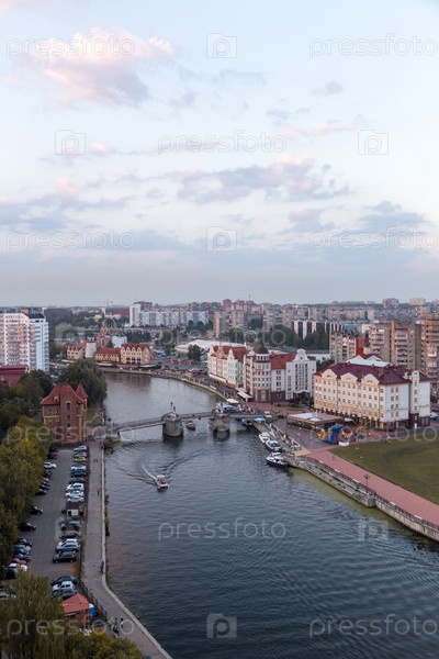 Сумерки центра Калининграда. Юбилейный мост, Рыбная деревня, Каналы реки Преголя. Россия