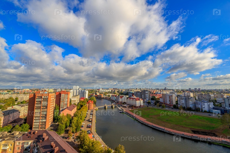 Пасмурная погода в Калининграде. Река Преголя, набережная Рыбной деревни и Юбилейный мост. Россия, Калининград