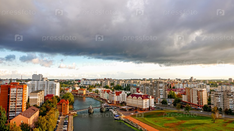 Пасмурная погода в Калининграде. Река Преголя, набережная Рыбной деревни и Юбилейный мост. Россия, Калининград