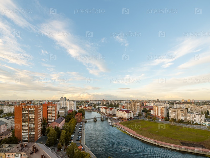 Вечерний Калининград. Река Преголя, набережная Рыбной деревни и Юбилейный мост. Россия, Калининград