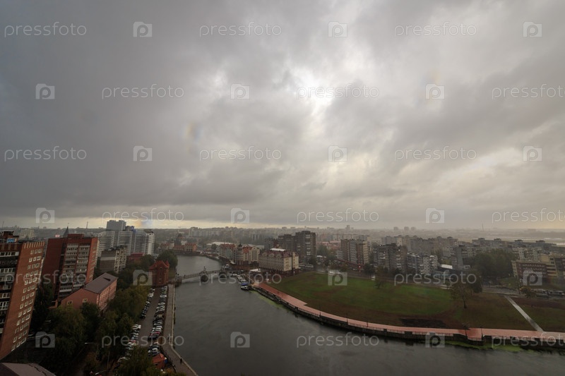 Дождь над городом. Центральная часть города Калининград, Россия