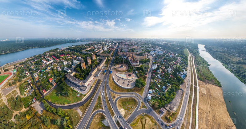 Калуга, Россия. Панорама города с воздуха. Автомобильная развязка. С высоты птичьего полета